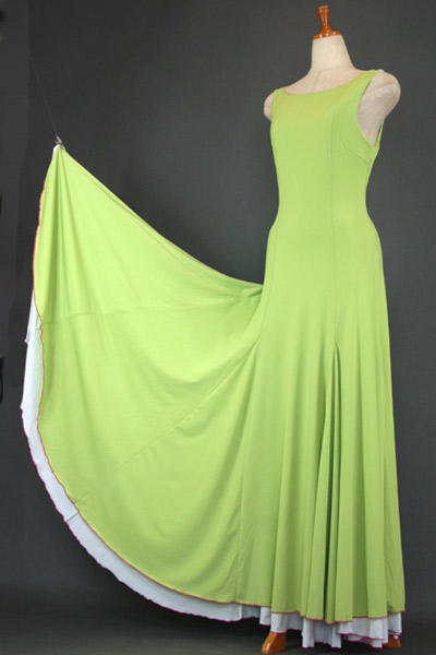 ノーファスナーで、なんと裏おもて別の色で着ることが出来、 表で着る時は、裏の生地がイレギュラーに裾から見えるデザインで、まるでペチコートを履いてるみたい、 裾を持って踊ると裏の生地が見えてキレイ。そして、裏に返して着れば、まったく別の色のドレスに早変わり。