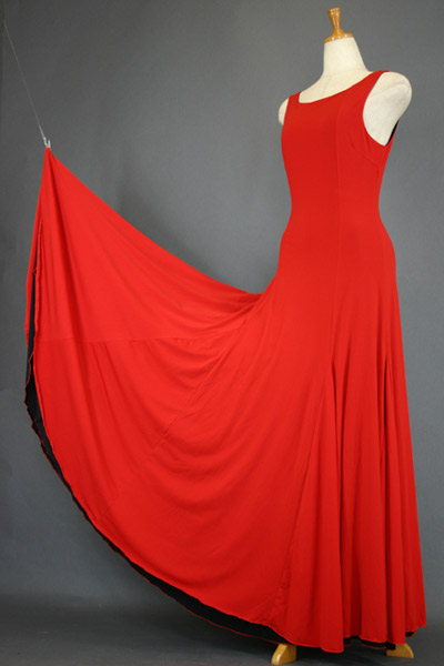 ノーファスナーで、なんと裏おもて別の色で着ることが出来、 表で着る時は、裏の生地がイレギュラーに裾から見えるデザインで、まるでペチコートを履いてるみたい、 裾を持って踊ると裏の生地が見えてキレイ。そして、裏に返して着れば、まったく別の色のドレスに早変わり。