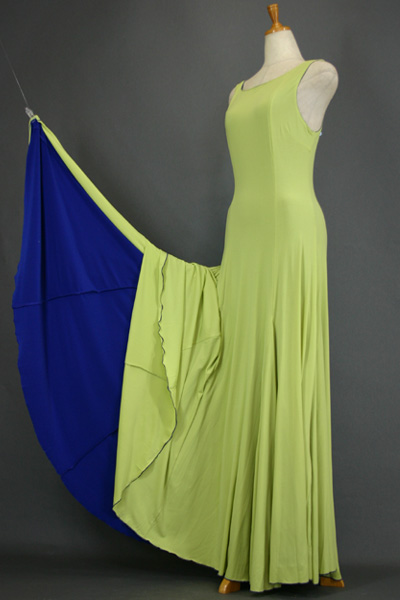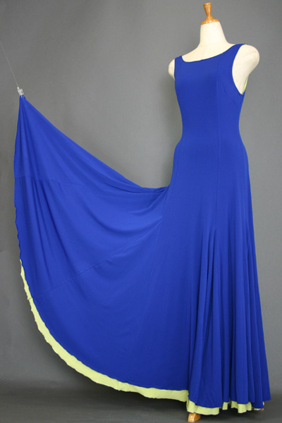 ノーファスナーで、なんと裏おもて別の色で着ることが出来、 表で着る時は、裏の生地がイレギュラーに裾から見えるデザインで、まるでペチコートを履いてるみたい、 裾を持って踊ると裏の生地が見えてキレイ。そして、裏に返して着れば、まったく別の色のドレスに早変わり。