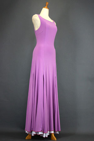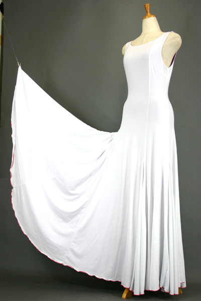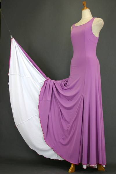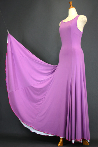 ノーファスナーで、なんと裏おもて別の色で着ることが出来、 表で着る時は、裏の生地がイレギュラーに裾から見えるデザインで、まるでペチコートを履いてるみたい、 裾を持って踊ると裏の生地が見えてキレイ。そして、裏に返して着れば、まったく別の色のドレスに早変わり。