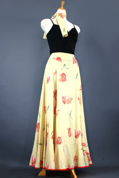 仕様は後ろ開きホック&ファスナー。ウエスト部はベルトのない7枚はぎ。(EG-TR13と同型)お尻の下辺りまで裏地が付いて透けません。同布のピキージョ(プチスカーフ)付きでステージにも。
